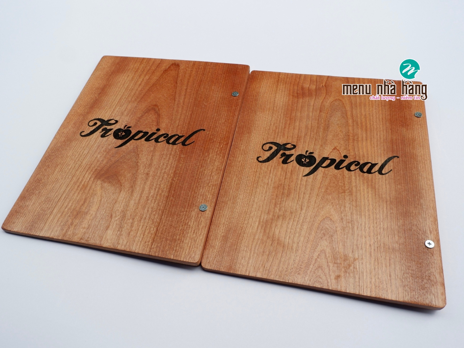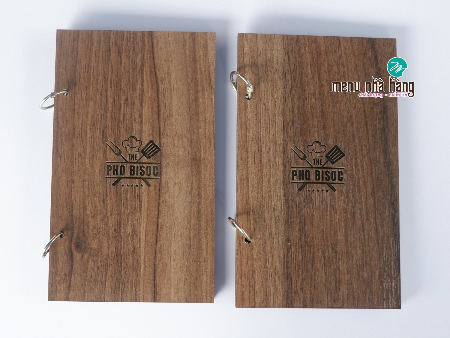 - Menu bìa gỗ khắc laser: phù hợp với quán kiểu mộc, gần thiên nhiên, hoặc vintage. Logo có thể khắc trực tiếp lên gỗ, bìa cứng cáp, không sợ ẩm ướt.
