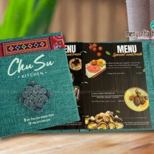 Menu Chu Su Restaurant: Menu này cũng dùng bìa vải, logo được in UV sắc nét. Họa tiết thổ cẩm độc đáo làm nổi bật phong cách Tây Bắc. Ruột là giấy C300 cán màng phổ biến, giúp hình ảnh đẹp và bền màu. Gáy còng Inox tiện lợi, bạn có thể thêm hoặc bớt trang menu một cách dễ dàng.