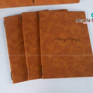 - Nhà hàng Ming Mings: Tông màu ấm, logo dập chìm trên nền da, gáy dây buộc linh hoạt giúp thay ruột dễ dàng tuy nhiên cần bảo quản kỹ hơn.