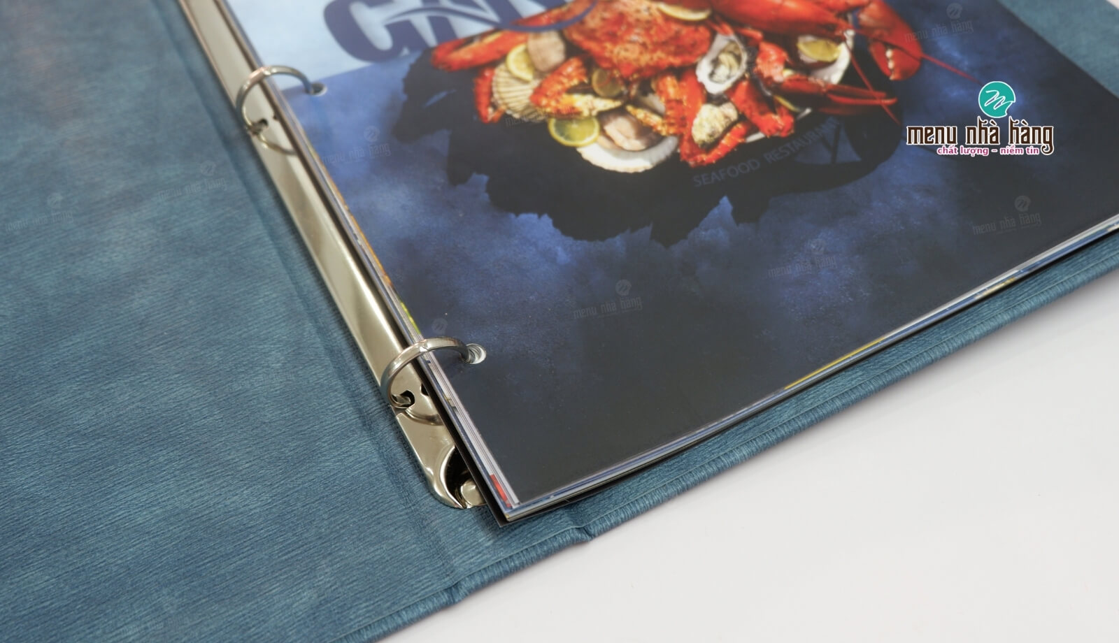 Mẫu menu nhà hàng hải sản này được thiết kế theo dạng bìa da gáy mở, bên trong cố định chắc chắn bằng khoen kim loại. Cách làm này giúp: