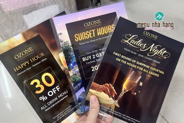 - Thực đơn phụ cho nhà hàng, khách sạn: Các nhà hàng lớn thường dùng menu da cao cấp làm thực đơn chính. Tuy nhiên, với các chương trình khuyến mãi theo mùa, menu đồ uống riêng hoặc menu món mới, họ vẫn ưu tiên in menu ép plastic tờ rời để linh hoạt thay đổi và tiết kiệm chi phí.